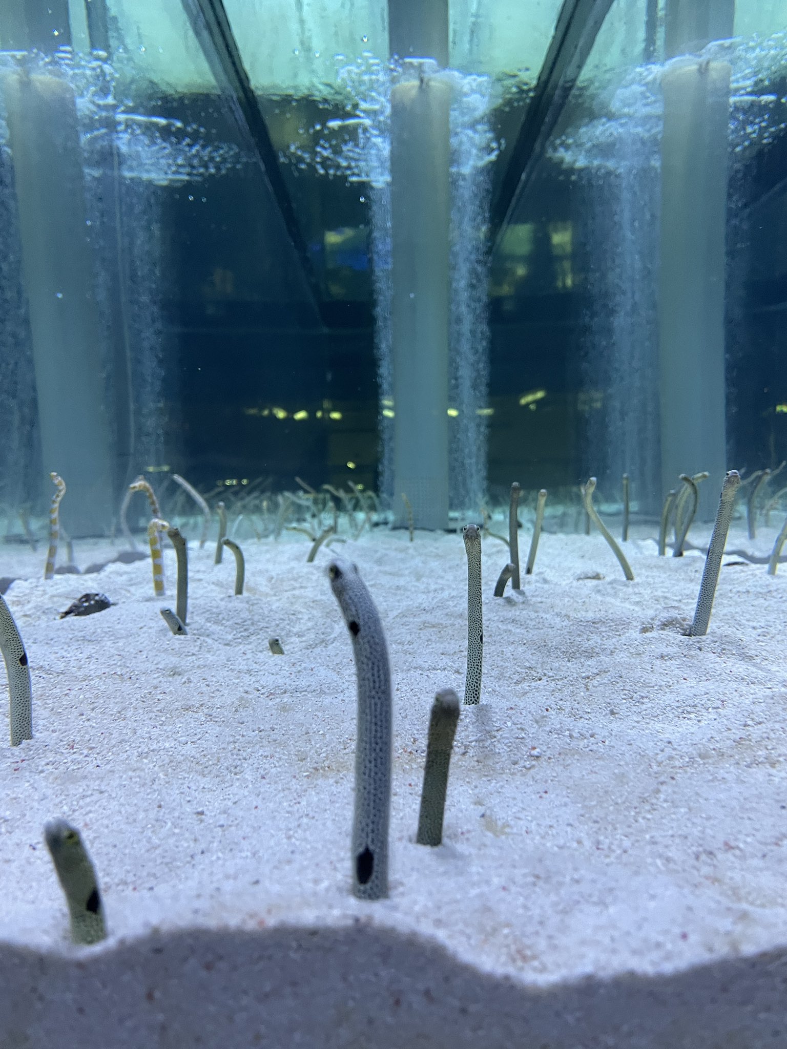 ファーストビューで出迎えてくれる淡水水槽、ミズクラゲのビックシャーレはほんとに幻想的だし、小笠原ブルーが映える大きい水槽のシロワニなど、チンアナゴ水槽や小さな生き物の展示も見やすくて良き。