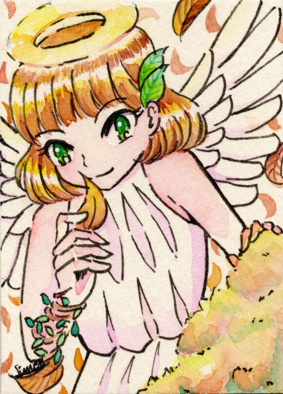 透明水彩で茶髪天使ちゃん描かせていただきました! アイディア考えるの楽しかったです。