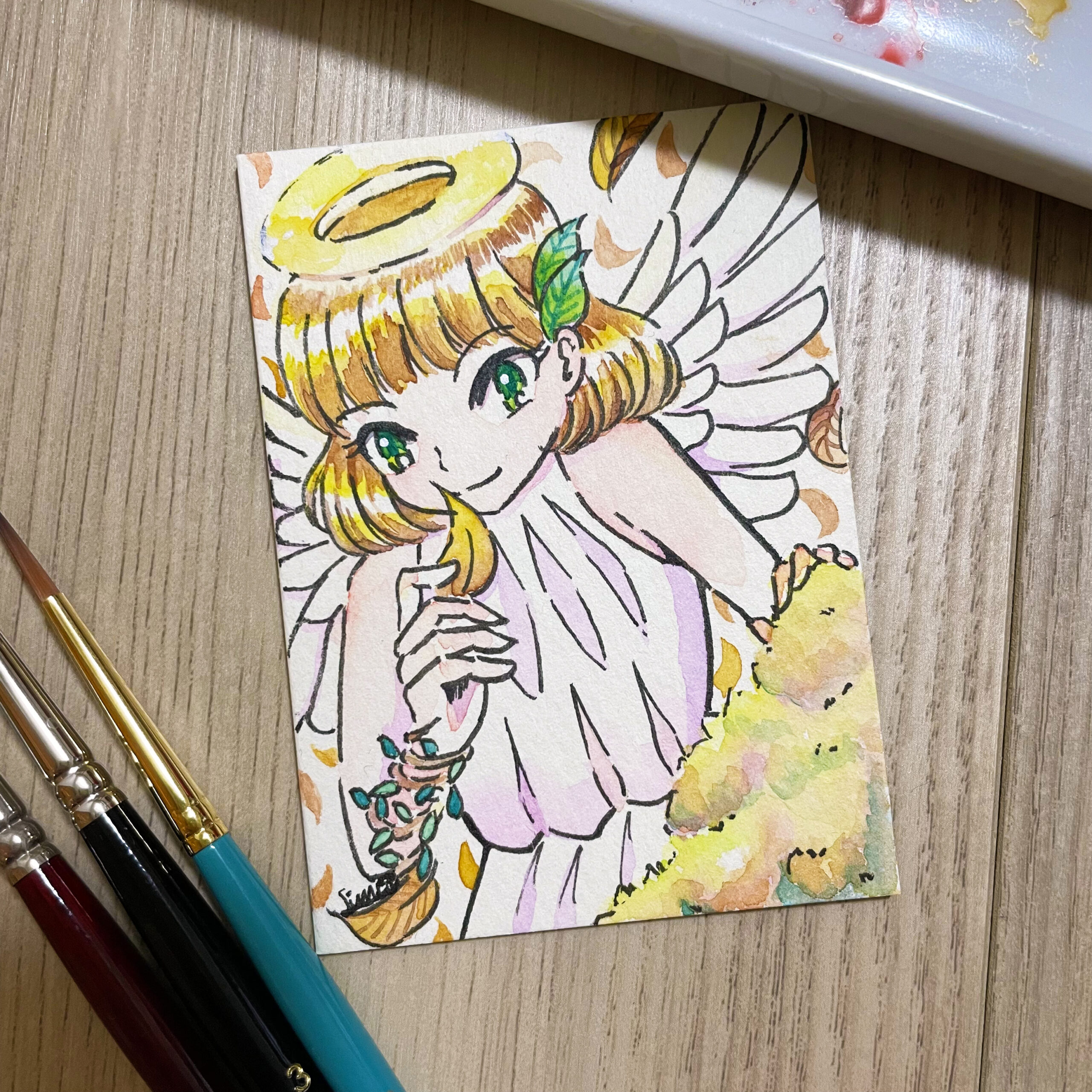 ウラバナシ お題①天使×葉っぱ×茶色 透明水彩で茶髪天使ちゃん描かせていただきました! アイディア考える…
